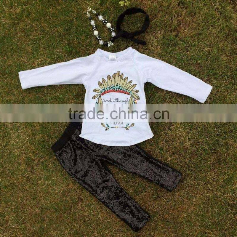 2016 New Design "Fierce" Feather Long Sleeves Black Sequins Pants Kids Clothing Girls Clothes Suit With Matching Accessories