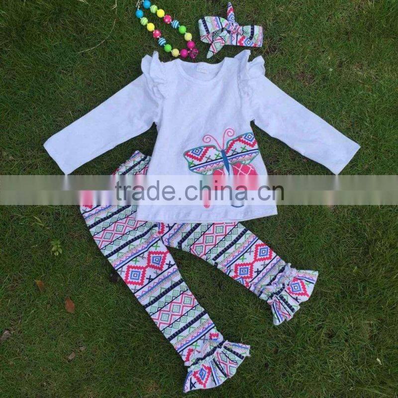 A limited edition long sleeves butterfly aztec pant outfit hot sell girls cute kids suit with matching necklace and headband