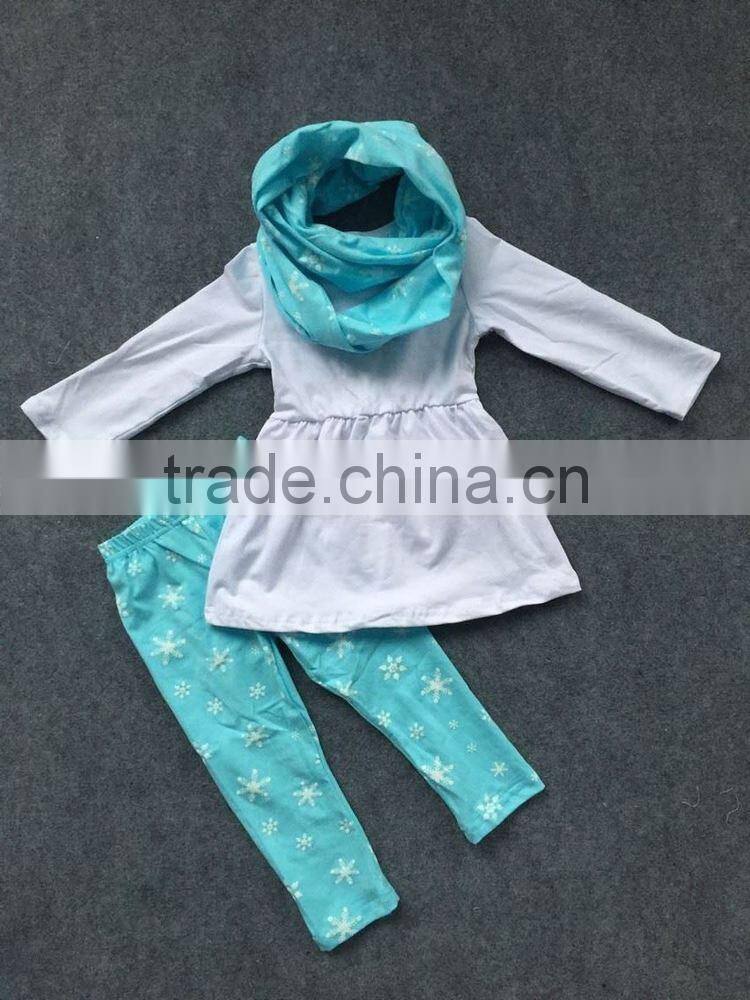 3 Pieces Scarf Hot White and Blue Top Kids Outfits Tribal Snowflake Pant New Design Hot Sell Boutique Clothes Sets