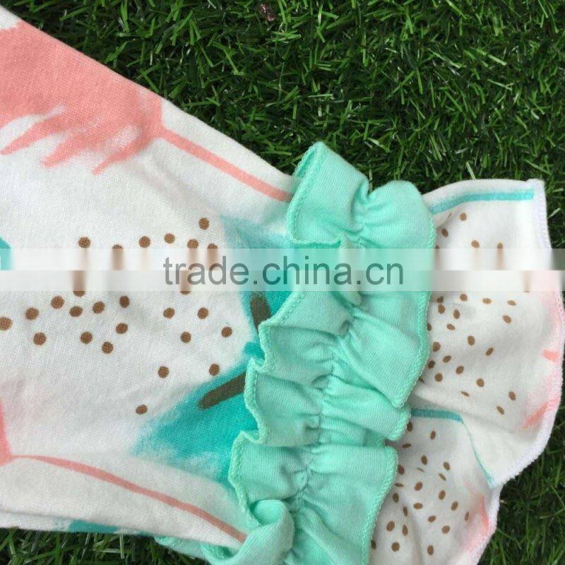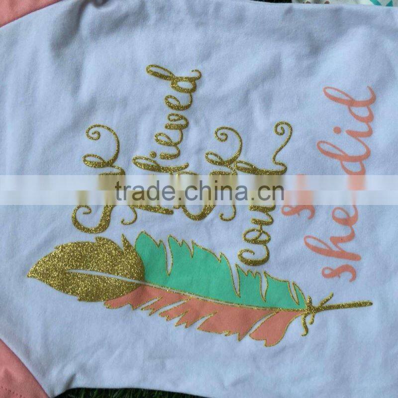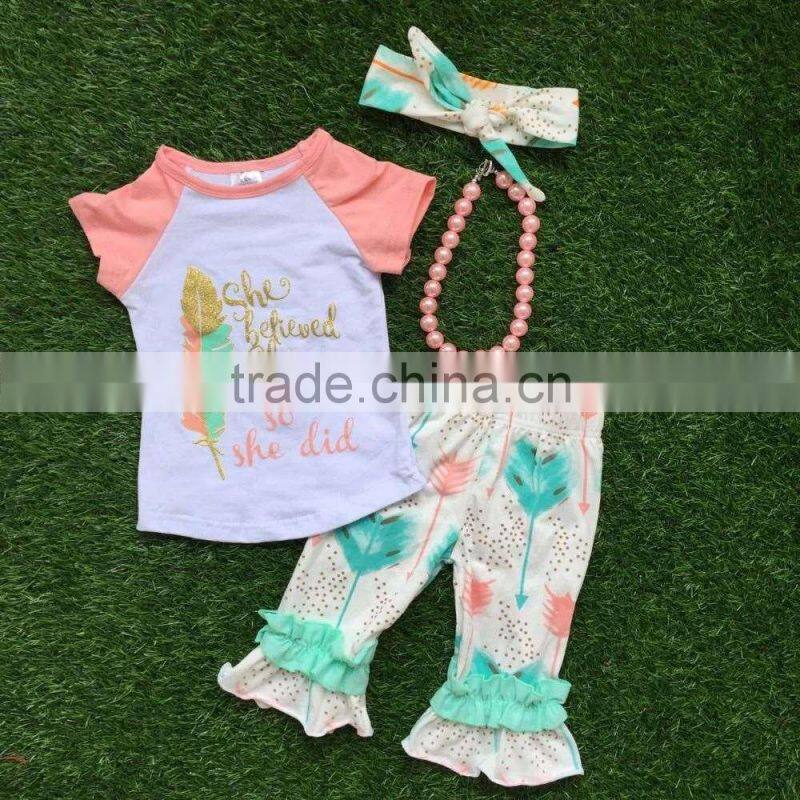 hot sale New arrival Girls Spring Summer design short sleeves feather capris with matching headband and necklace set
