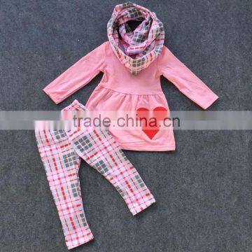 2016 Valentine's Day 3 Pieces Scarf Pink Top Kids OUTFITS Heart Suit Pant Set Hot Sell Boutique Clothes Kids Sets