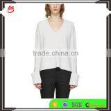 Women Wearing Sexy Design V Neck Blank White Sweater With Rolled Cuffs With Buttons