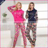 Top Design Women Fancy Flower Printing Pajama With Hoody+ Long Pant Winter Women Pajamas Set Wholesale