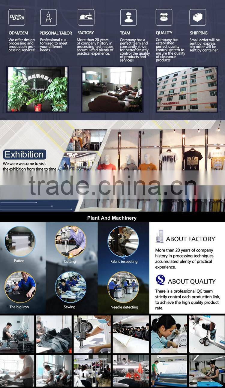Guangzhou Shengyilang Garment Trading Co.,Ltd. is a professional manufacturer of T-shirt , Polo shirt , Singlet , Tank top , Hoodie and Jacket. We have dealt in this industry for more than 15 years in the name of " zhongtian". Our customers are mainly from USA, Canada, Russia and Singapore. To provide our customers with what they need is our goal. Honesty and credibility is our advantage in this field. We always put the high quality in the first place cause we aim to push our products in high end markets.