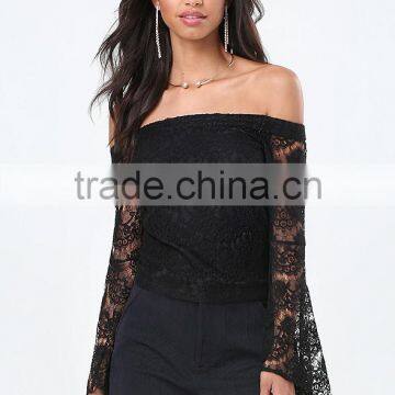 Clothes woman fashion long bell sleeve off-shoulder lace blouse black for wholesale 2017