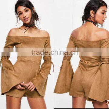 2017 new brown faux suede flare tie sleeve women wholesale playsuit