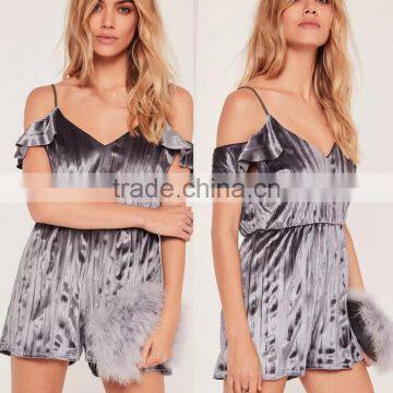 2017 summer sexy pleated velvet frill cold shoulder sleeve womens playsuit