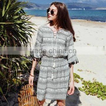 Summer dress for women new national style printing dresses with ropes short sleeve V-neck elegant beach dresses