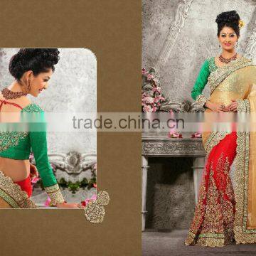 Elegant Golden & Red & Green Color Combination Blooming Bliss Designer Sarees Collections