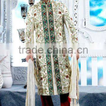 cream brocaded fabric Sherwani Designed With green patch and Fancy Crystal, Beads Sequins, Stone and Pitta Work.Embroidery On Front Border, Collar, Back And Cuffs Gives A Charming Effect.