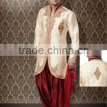 Mens Sherwani. Off white and Maroon silk sherwani designed with Sequins,Beads, Stone,