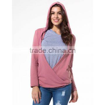 Stylish Street Wear Women Pink Plunge Wrap Front Long Sleeve Hoodie