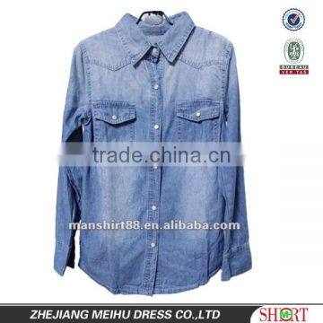 100% cotton washed women's top blouses denim shirts with 2 pockets and snap buttons