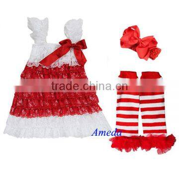 Christmas White Red Cap Sleeves Lace Ruffles Pettidress Warmers Headband 3pcs 6M-5Y