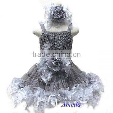 Silver Gray Rose Pettiskirt Wedding Party Flower Girl Feather PettiDress Matching Sash and Headband 1-7Y