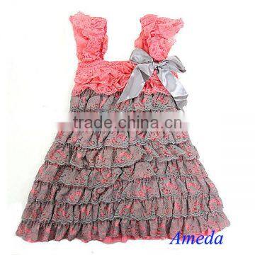 Girls Coral Pink Silver Cap Sleeves Lace Ruffles Pettidress Party Dress 6M-5Y