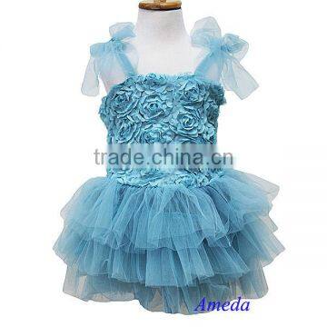 Teal Blue Rosettes Rose Tutu Party Dress Wedding Flower Girl Pettiskirt 1-7Y