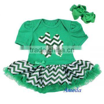 Baby St Patricks Day Green Chevron Shamrock Bodysuit Pettiskirt With Headband NB-18M