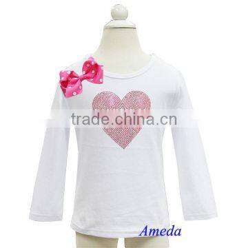 Hot Pink Rhinestone Heart Polka Dots Bow White Long Sleeves Tee 3M-7Y