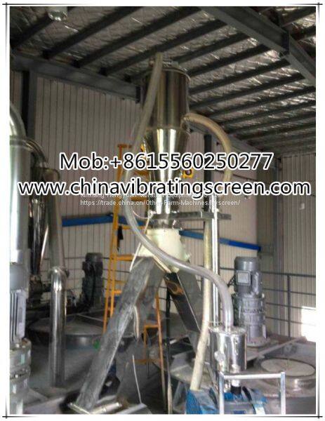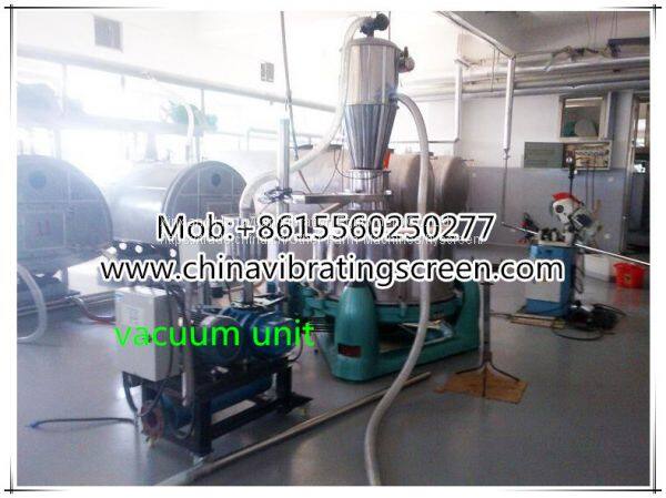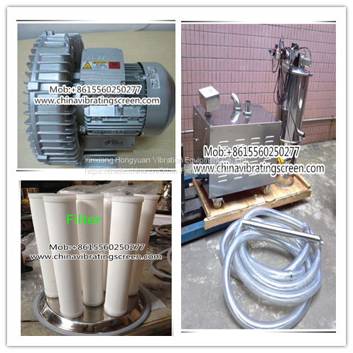HY series vacuum feeder for powder granule is mainly consisted of swirl air pump, first stage air-solid separating chamber, compressed air jetting device, second stage air-solid separating chamber, quick-open clamp, soft tube, sucking nozzle, control cabinet and three-way valve.