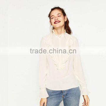 2016 Online wholesale latest simple design elegant lace inserts high neck designs women's ruffle shirt ladies top and blouses