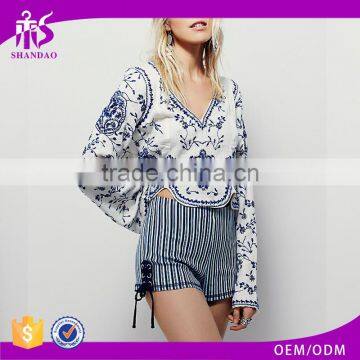 2016 Guangzhou Shandao Hot Selling Fashion Autumn Casual Long Sleeve V Neck White Embroidery Cotton Designs Ladies Tops |