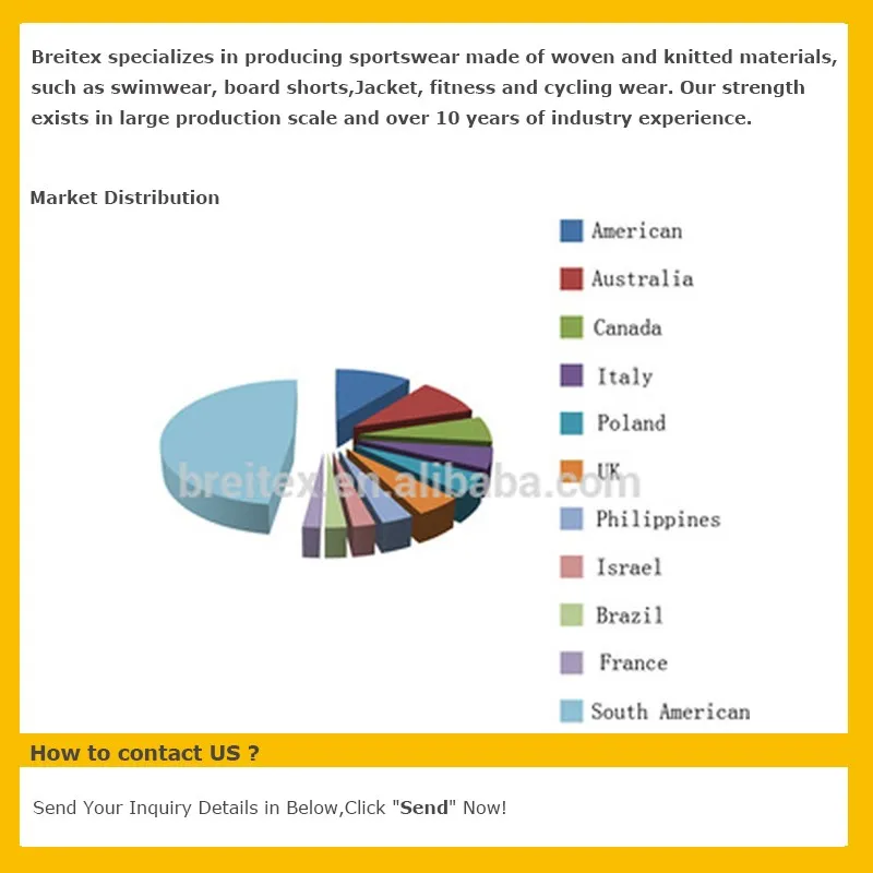 Breitex specializes in producing sportswear made of woven and knitted materials, such as swimwear, boardshorts, fitness and cycling wear. Our strength exists in large production scale and over 10 years of industry experience.