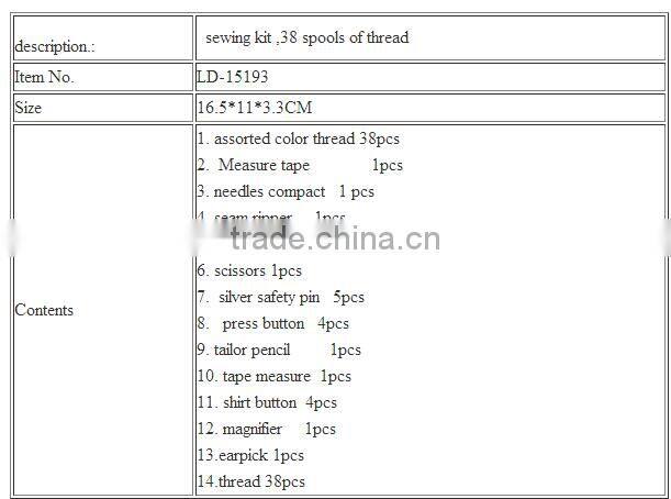 Zhecheng Lida essential co.,ltd have more than 10 years history specialized in sewing kit set manfuacture .our business scope had included hook & loop tape ,sewing kits, thread ,pins,elastic ,scissors,pin cushion,thimble,tape measure,button or snap fasteneretc. we have good reputation in our customer's side .