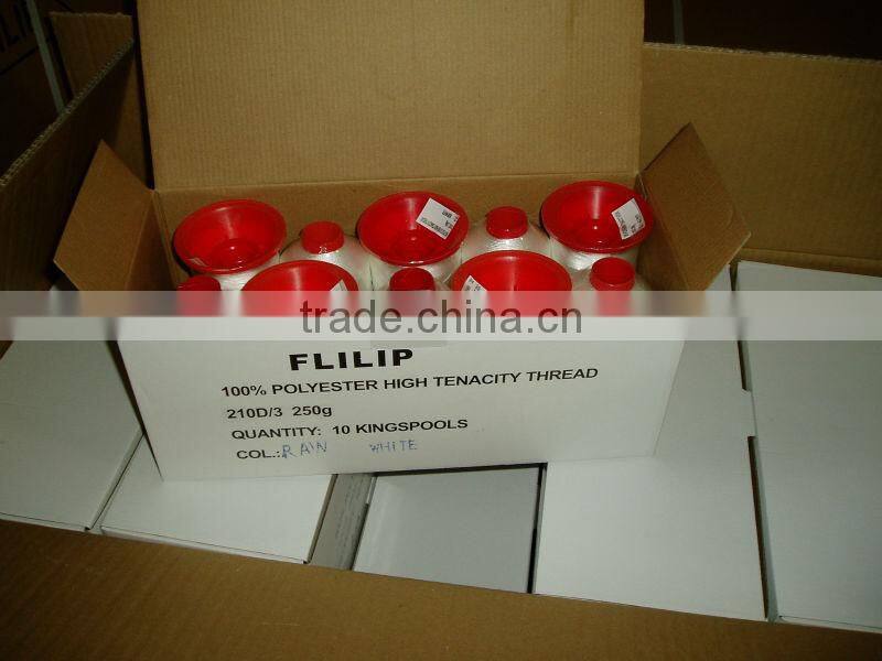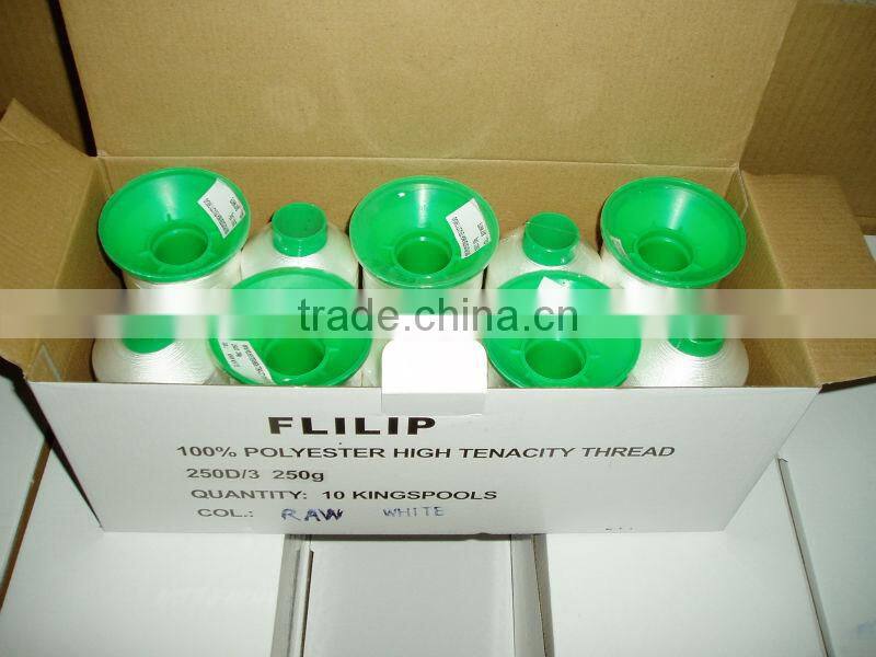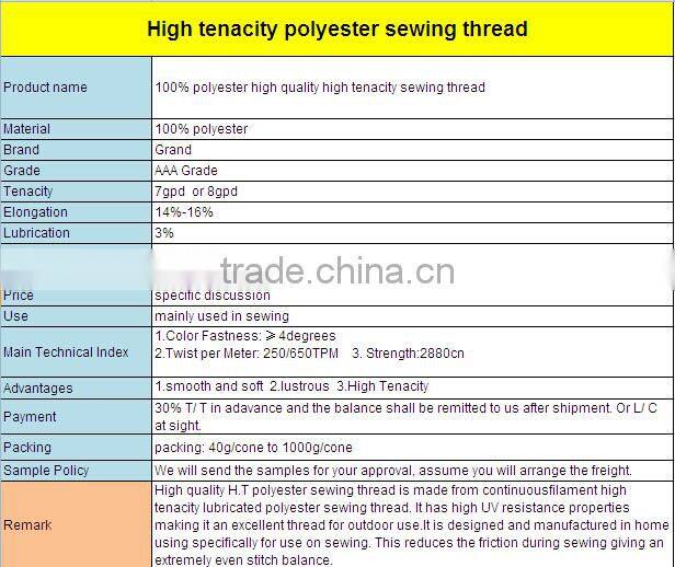 We are in a good position to supply high quality high tenacity polyester filament sewing thread with copetitive price. Most of our thread are exported to India, Turkey and south Asia, middle east and north Africa. Our thread has good tenacity (7.0gram / denier) and low elongation, offer a excellent stiching on high speed sewing machine for leathers and shoes. If you need much stronger thread, please let us know your particular requuirement.