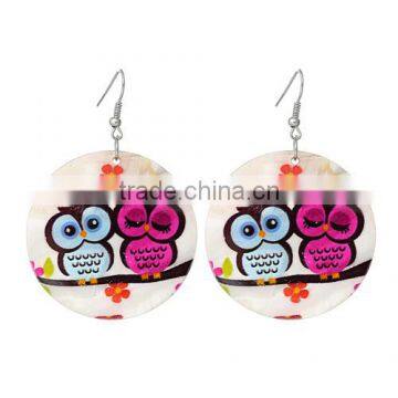 Silver Tone Hook Round Blue & Fuchsia Halloween Owl Pattern Fashion Shell Dangle Earrings 6.5cmx4.5cm
