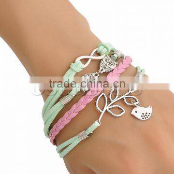 Custom Design Wax Rope Braiding Bracelets Green & Pink Antique Silver Leaf & Halloween Owl Infinity Symbol 17.5cm Long,1Piece