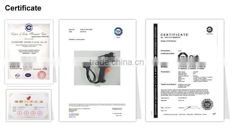 Our hot melt glue gun can pass the test of CE, GS, UL, CUL, EMC, and Rohs.