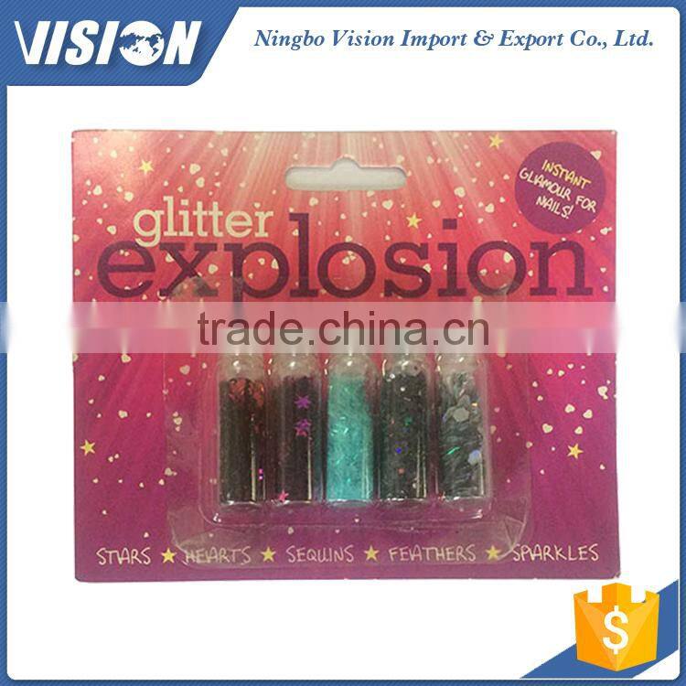 | Clear glass bottle with translucent plastic stopper | Each bottle is approx 35mm tall (43mm including lid), 11mm diameter. Each bottle to be filled with glitters. 5 different colour glitters to be chosen from swatch in various shape and sizes. Please note we will require special effect such as iridescent or holographic glitters. |