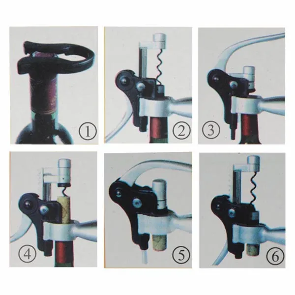 2Firmly grasp the grip handles with one hand and swing lever to full open position. Put the opener over the bottle until it stops in the eact position. Grip the bottle neck firmly with the grip handles. The black screw comes out of the metal ais.