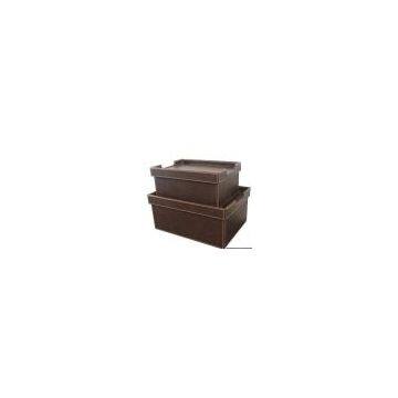 Description:Specifications: 6055A: 40 (L) x 30 (W) x 19 (H)cm 6055B: 34 (L) x 24.5 (W) x 15.5 (H)cm Materials: PVC or PU, MDF, flocking NT6055 is one item of our box series. We design and manufacture 9 series of about 700 items of leather products. All kinds of materials and designs are available from us. Outer packing: 4 sets/ctn Carton dimensions: 63x42x41cm N.W: 14.5kg G.W: 15.5kg