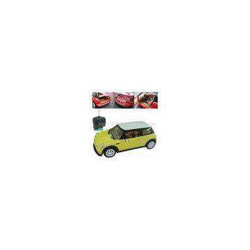 Description:Features: 1) R/C car (1:6) 2) Product dimensions: 65 x 30 x 25cm 3) Simulates the real mini cooper car with real opening doors, hood and hatch 4) Can go forward, reverse, left and right with sound and light signal 5) 3 different speeds selectable with matching engine sound 6) Remote lock and unlock system with sound and light signal 7) There is engine sound when car is unlocked and indicating lights when car is locked 8) Press the light button to activate the headlight 9) Press the horn button to activate the car's horn 10) 3 colors available: red, yellow, silver 11) Speed: 7-8km/h 12) With EN-71 EN-50088 approval Outer packing: 2pcs/ctn Carton dimensions: 84.5 x 39 x 64cm Caron volume: 0.211m3 N.W.: 12kg G.W.: 14kg Conveyance: Qty/20' GP: 133 cartons