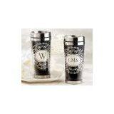 Just like the drinks your bridesmaids place inside, these personalized travel tumblers are hot and cool at the same time! A veritable masterpiece of design inside and out!, first-quality insulation is surrounded by a delicate damask pattern in classic ivory and black and designed to keep beverages at just the right temperature. Personalized with a single initial or monogram allows your drinks to travel in style--just like you! Features and facts: 1. Elegant ivory-and-black, insulated travel tumbler with damask design and silvery trim 2. Expertly crafted from sturdy plastic with heat-deflecting rubber bottom 3. Removable cap includes sliding panel on top for open/close control 4. Tumbler measures 18.4 cm h x 7.6 cm in diameter and holds 473.18 ml of hot or cold liquid 5. Tumbler coordinates with the "Kensington" Apron and Oven Mitt, Cosmetic Travel Bag and Tote