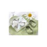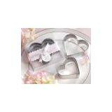 Treat your guests to a wedding favor that's both meaningful and tasteful. Speak from the heart with these charming heart-shaped cookie cutter favors__a sweet way to say "thank you" and be remembered. Features and facts: Two stainless-steel, heart-shaped cookie cutters Larger heart measures 2 1/2" wide; smaller heart is 2" wide Cookie cutters nest in clear gift box decorated with scalloped, pale-pink band tied with white-grosgrain ribbon and matching "Cut Out for Each Other" tag Gift box measures 2 1/2" h x 2 3/4" w x 3/4" d