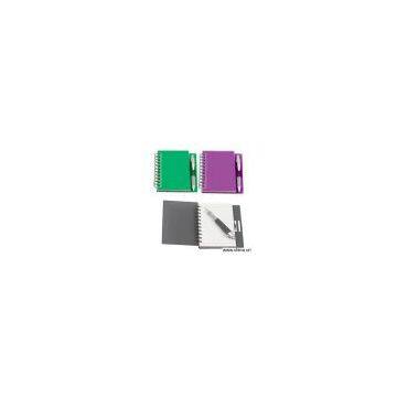 Description:Features: 1) Color plastic cover notebook with ball pen 2) Convenient for traveler 3) Customers' logos are welcomed 4) Binding: double wire-O with pen holder