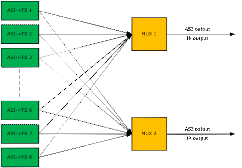 Two channels IP output multiplexer is an enhanced TS re-multiplexer for digital TV broadcasting head-end system. The multiplexer has all the functions of normal TS multiplexer, including programs multiplexing, PSI/SI editing, PID re-mapping, service filtering etc. The multiplexer can insert EPG (Electronic Program Guide), CA (Conditional Access) and data casting information into each output stream. Different from normal multiplexer, this multiplexer has eight ASI inputs (DVB/C/S/S2/T optional), two separate ASI output ports and two separate megabit IP outputs. The bit rate of output stream can be up to 216Mbps. For the application area, this device is especially applicable to the FTA (Free to Air) system multiplexing.