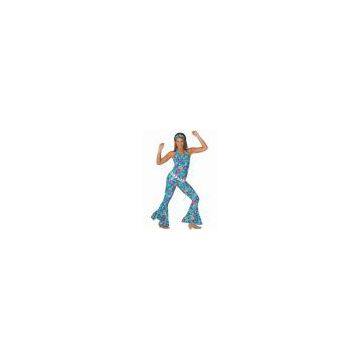 1. Floral print unitard has a halter tie neck and bell bottom pant legs.