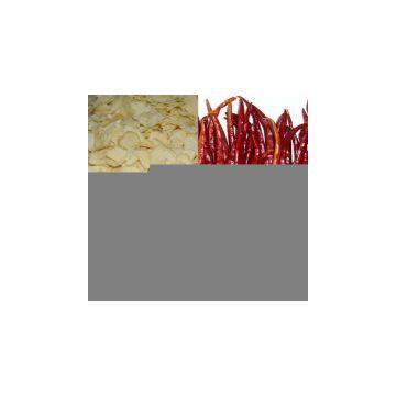 Description:Dehydrated garlic flake Specifications: Colors: normal white or light yellow Broken rate: 5% max Thickness: 1.6-1.8mm Moisture: 6% max. SO&sub2;: 50ppm max. Packing: 12.5kg x 2 aluminum foil bags/carton Yunnan chilli with stem and without stem Specifications: Length: 3-12cm Moisture: 16% max. Yellow macula: 5% max. Impurities: 2% max. Crushes: 5% max. Packing: 20kg/PP woven bag
