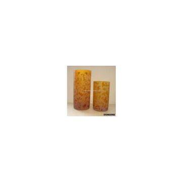 Description:Item No : FE710-0071 Description : glass candle holder sprayed amber color , sand-blasted with European pattern Mouth-blew Size :16cmDia, 26/36cmH Packing : 2pcs/set/brown box, 2sets /CTN Master : 67x34x38cm MOQ: 4000SETS Note : packing can be changed by special need (brown box , polyfoam packing ,color box, etc)