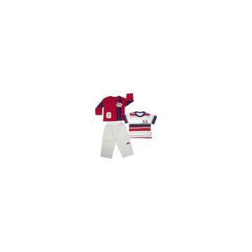 One knitted long sleeve shirt, one knitted short sleeve shirt and one pair of woven pants are included. Inner packing: Short sleeve shirt with a hanger in front, long sleeve shirt with a hanger behind and pants with a hanger last in a 5C ploybag