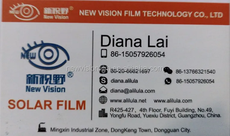 Guangdong New Vision Film Co., Ltd. is located in Yongfu Road largest auto parts. We are a professional manufacturer of solar window film, set design, development, manufacturing as a professional manufacturer.We focus on a series of fashion accessories, a wide range of diversity, reasonable price and on-time delivery.