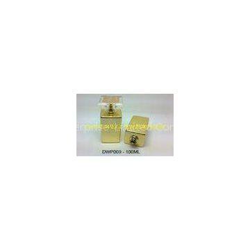 Crystal white glass bottles in for Ladies’ perfume. Glass bottle in UV GOLD metalized. Square shape perfume glass bottle. Available size: 100ml. Samples available under request.Description: