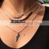 Three Layered Link Chain Simple Necklace Black Beaded Leaf Flower Pendant Necklace