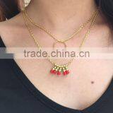 Red Beaded Tassel Pendant Necklace Double Layered Ring Simple Link Chain Necklace