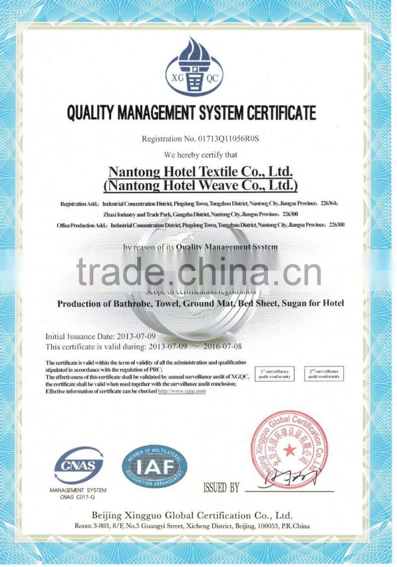 Nantong Hotel Textile Factory(Short term:Hotel-tex)was established since 2002,through over 5 years the company quickly became a fully integrated plant producing hotel linen and down & feather products to meet with the changing of the hotel industry.It always produces an extensive range of hotel linen to distributors, including Bath Towel, Face Towel, Hand Towel, Bath Mat, Bath Robe, Kimono, These were not only supplies to stars hotels in China but also exported throughout the world to different distributors, such as Japan, Singapore,Korea,Far East and European countries.We are always professional and diligene in production, aiso use the key of faith to cooperate with our distributors and clients as usual.