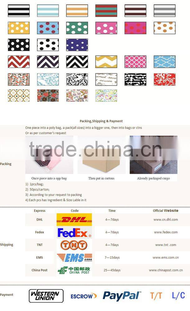 Packing | 1) 1pcs/bag; 2) 50pcs/carton; 3) According to your request to packing 4) Each pcs has Ingredient & Size Lable in it |